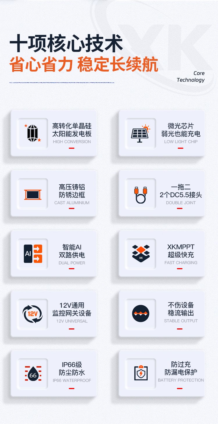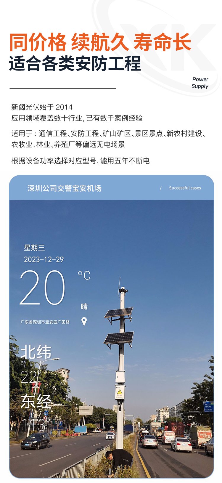 新闊12V太陽能監(jiān)控供電系統(tǒng),智能雙路供電,白天太陽能板直接給監(jiān)控供電,多余電量存入電池,減少電池放電次數(shù),延長電池壽命。5V、12V、24V、48V皆可定制。穩(wěn)定大電流供電,電流至高達(dá)到5A,能給中大型設(shè)備穩(wěn)定供電,解決供電不穩(wěn)定,設(shè)備無法全功率工作的問題。